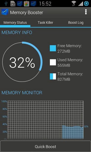 - Memory Booster provides a live chart to demonstrate your device's total/free memory and current memory usage.